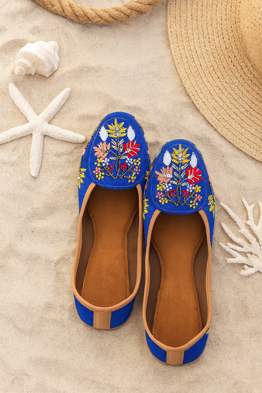 Crafted on a royal blue base, this jutti features vibrant multicolor floral embroidery with delicate beadwork. Finished with a cushioned tan lining and leather back strip, it blends comfort with traditional elegance—perfect for festive or casual wear.